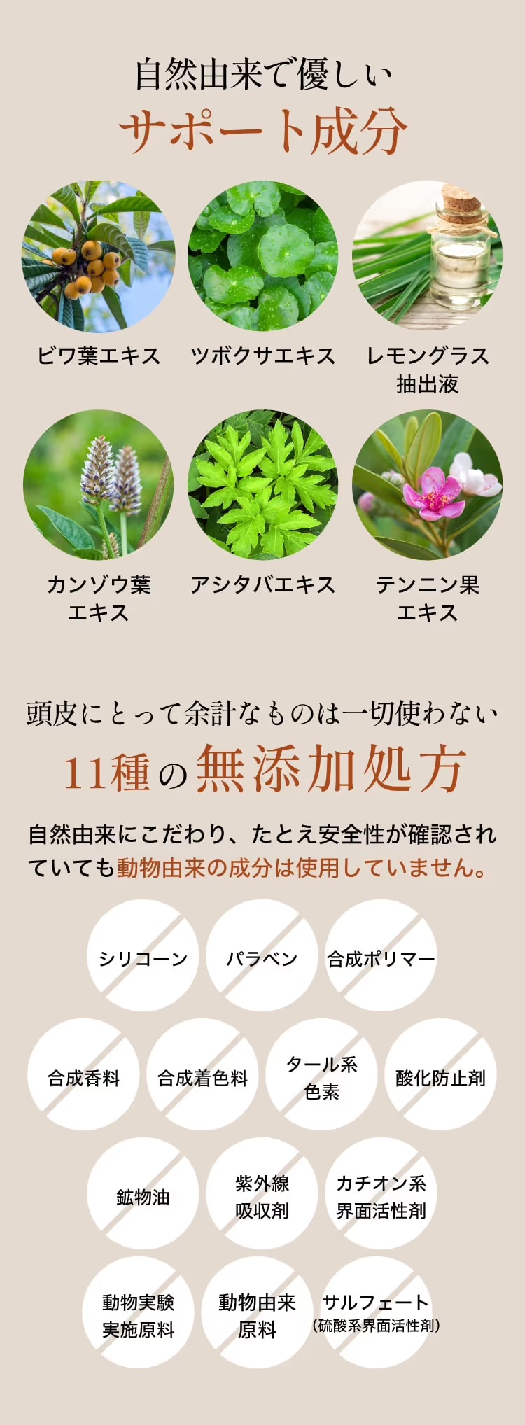 シリコン、パラベン、合成ポリマー、合成香料、合成着色料、タール色素、酸化防止剤、鉱物油、紫外線吸収剤、カチオン系界面活性剤、サルフェート(硫酸系界面活性剤)が不使用