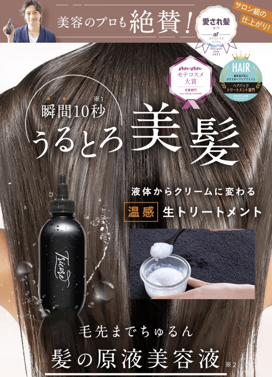 液体状のトリートメントが水分に反応してクリーム状に変化し、髪1本1本に密着。
