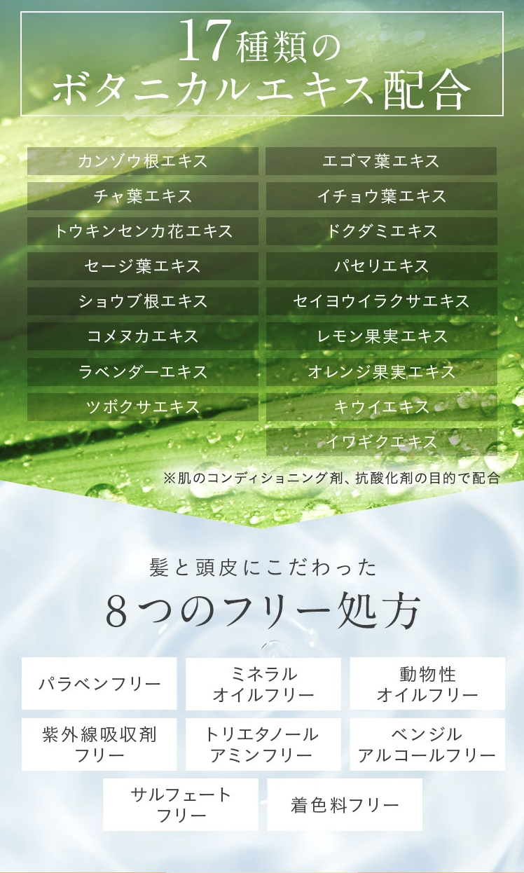 「パンテノール」「サリチル酸」「メントール」、17種のボタニカル美髪エキスを配合。