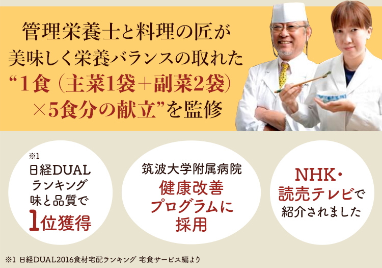 3.1食(主菜1品・副菜2品)で平均、糖質30g以下、400kcal以下、塩分3.5g以下